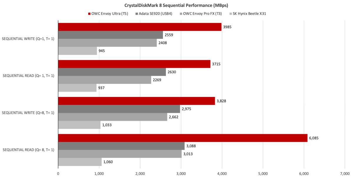 By way of comparison, that’s roughly as fast as an NVMe SSD on the PCIe 4.0 bus. And a PCIe 4.0 NVMe SSD is exactly what’s inside the OWC Envoy Ultra portable drive I used to test Thunderbolt 5 storage.